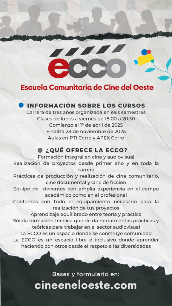 La Escuela Comunitaria de Cine del Oeste es parte fundamental del programa Oeste Audiovisual, un programa en pleno desarrollo de una política pública que toma al cine, en sus diversas expresiones desde la visualización hasta la realización, como una herramienta de “inclusión social” y un espacio para la generación de “cultura comunitaria”, tomado a la Cultura como un “derecho ciudadano” contribuyendo a la formación de personas libres